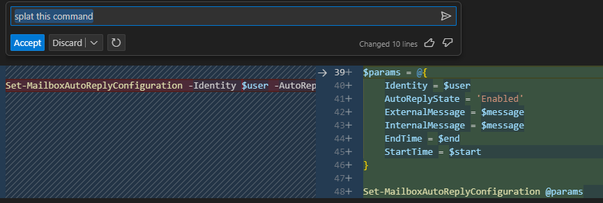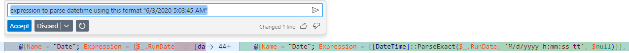 @{Name = "ItemCount"; Expression = {$_.'Items processed'}}I would get a blank value as [datetime] was not expecting the US format. I brought up the chat feature by pressing Ctrl + I. and I wrote what I needed. You can see in the image below that it gives you a suggestion next to the line of code.